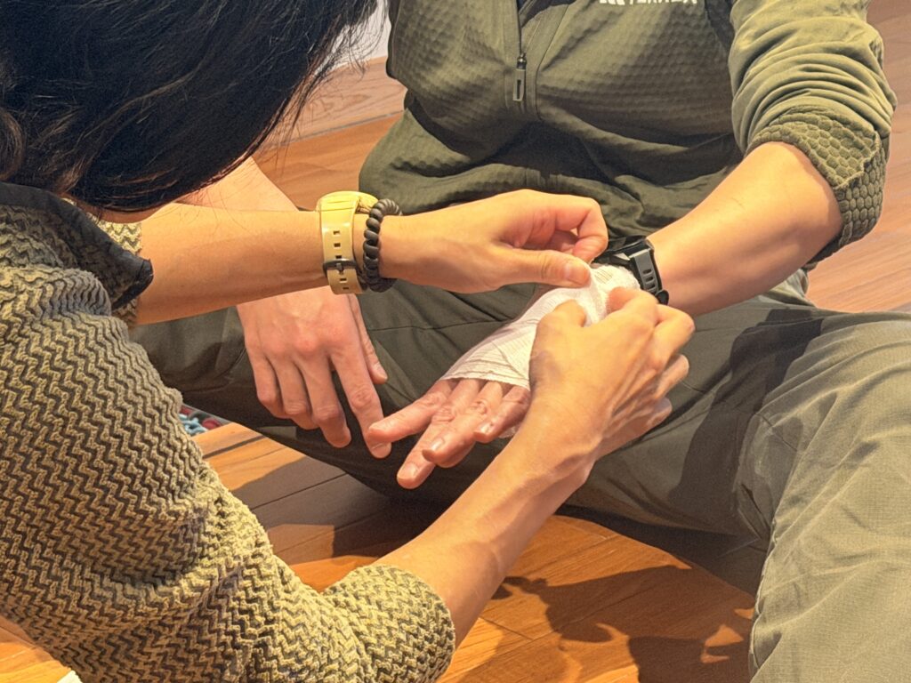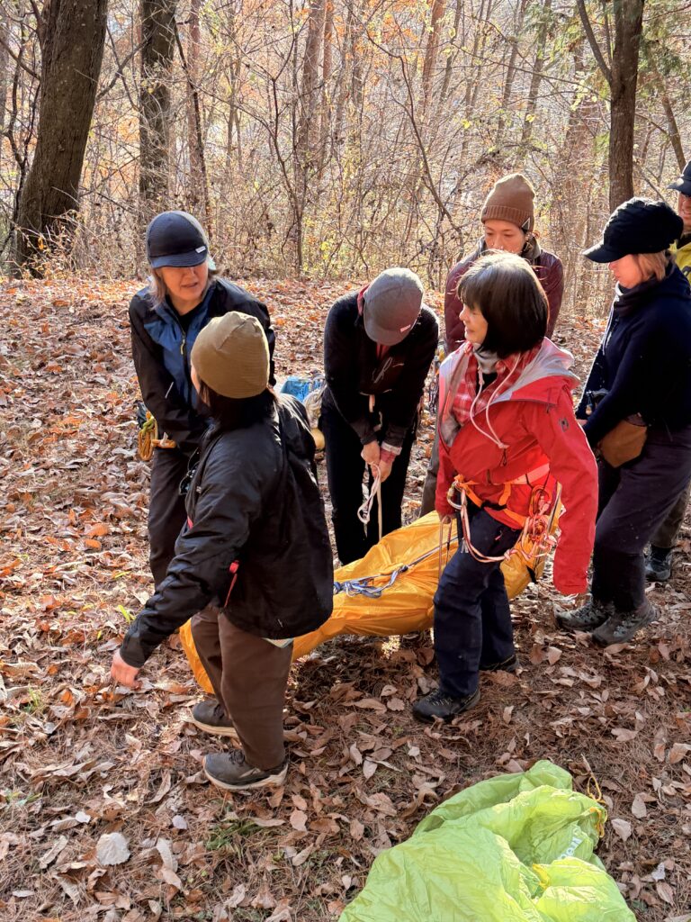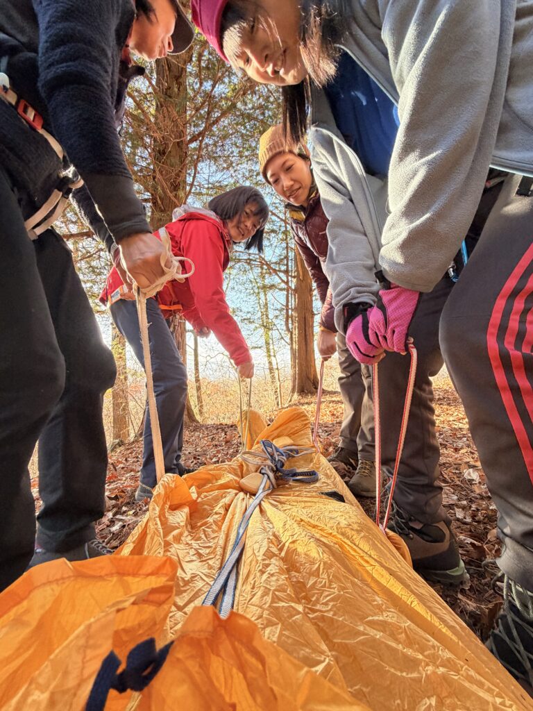 今回は、第2回ということで、第1回で実施した野外救命に関する知識や技術の基礎復習に加えて、よくある怪我や発病等への対応方法、また、補助ロープやツエルトの活用方法など、野外フィールドでの想定シミュレーションを通して考え学ぶ機会となりました☆